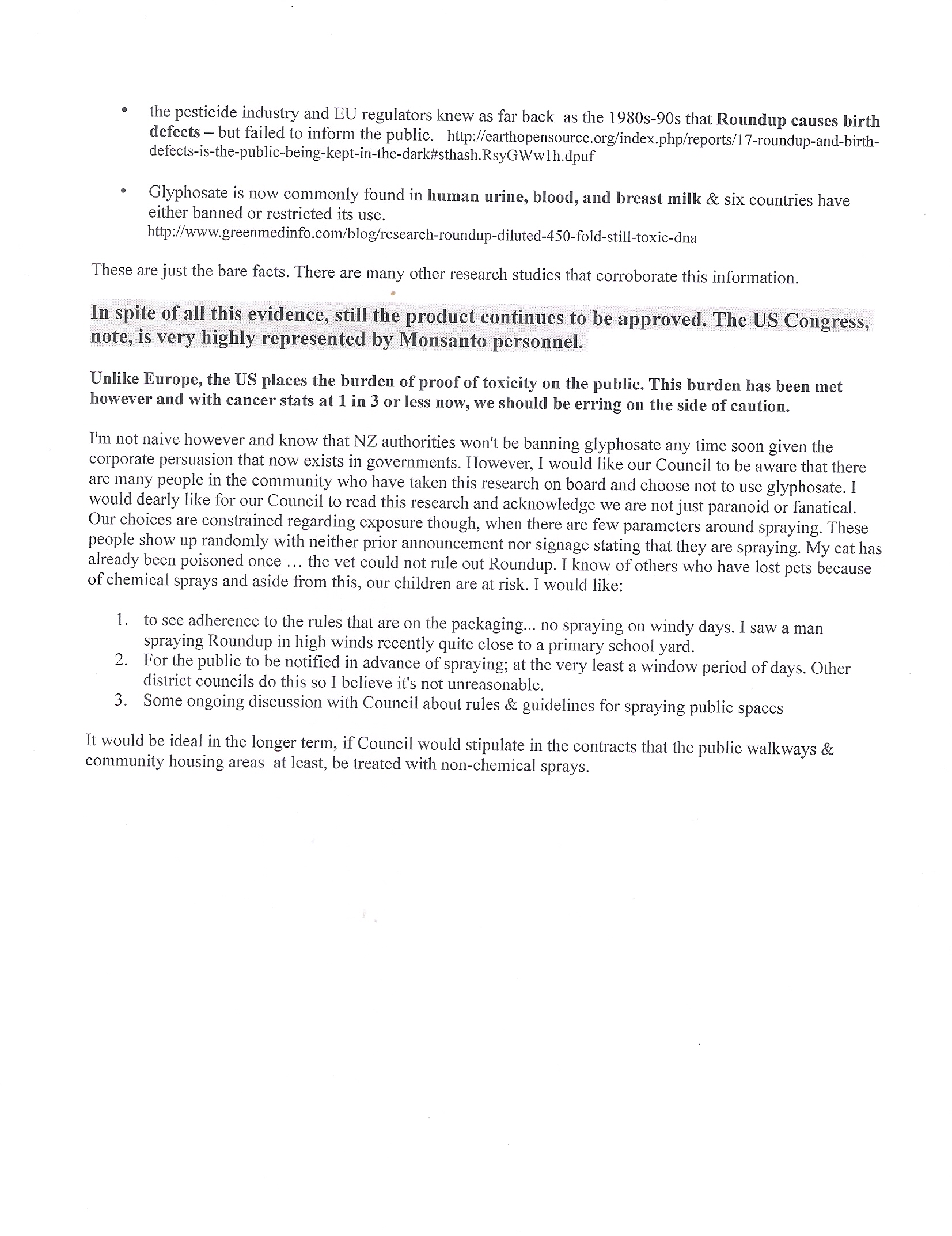 On November 27th I presented to the Council Forum information (including credible research) regarding the need for some parameters around the spraying of chemical sprays in public places. Click on the documents to read: