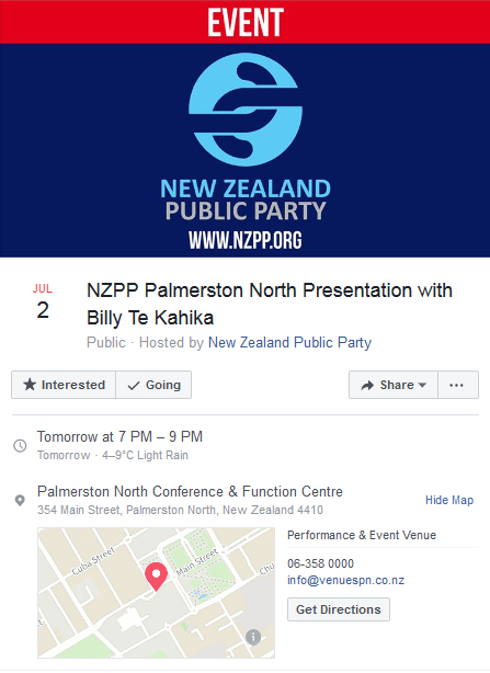 The NZ Public Party has a public meeting in PN tomorrow 2 July