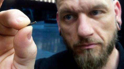 FILE – In this March 14, 2017, file photo, Jowan Osterlund from Biohax Sweden, holds a small microchip implant, similar to those implanted into workers at the Epicenter digital innovation business center during a party at the co-working space in central Stockholm. Three Square Market in River Falls, Wis., is partnering with Sweden’s BioHax International, offering to microchip its employees, enabling them to open doors, log onto their computers and purchase break room snacks with a simple swipe of the hand. More than 50 employees are voluntarily getting implants Aug. 1 at what the company is calling a “chip party” at its River Falls headquarters. (AP Photo/James Brooks, File)