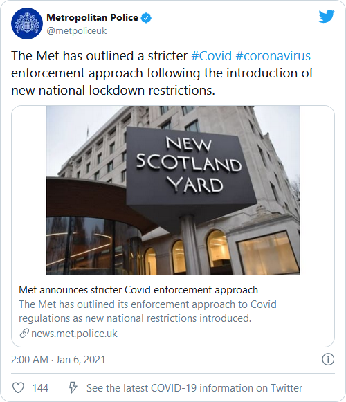 The London Telegraph reports that London’s MET police issued a statement noting that “With fewer ‘reasonable excuses’ for people to be away from their home in the regulations, Londoners can expect officers to be more inquisitive as to why they see them out and about.”