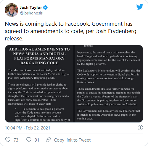 Treasurer Josh Frydenberg said Facebook had promised“to restore Australian news pages in the coming days”in a statement on Tuesday, noting the Scott Morrison administration would soon introduce“further amendments”to the media bargaining code.