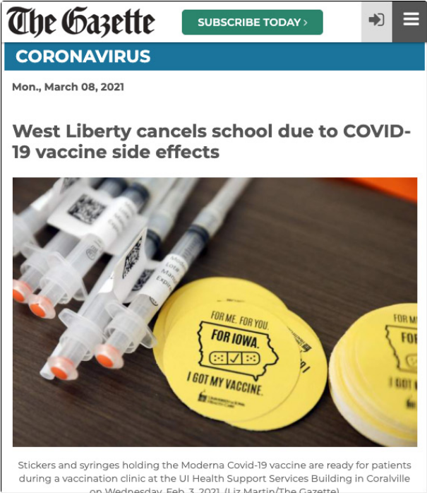 According to local news outlet The Gazette, staff members at the West Liberty School District in Eastern Iowa received their second dose of the Moderna shot during a vaccine drive on Saturday.