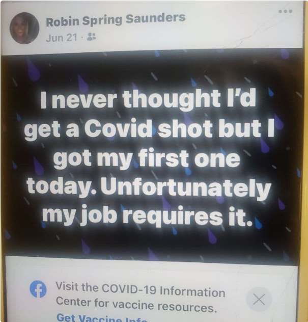 Appearing skeptical, 45-year-old mom Robin Spring Saunders wrote on social media that she received her first jab on June 21 and that it was mandated by her place of work.