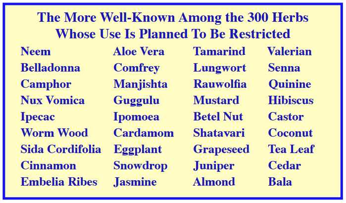 3. Herbs, vitamins, and remedies are then classified as medicines only available to be used by registered doctors. This grants medical authorities back door “patents” on indigenous plants that will have a global reach within all member countries without having to invoke patent law. Already hundreds of Ayurvedic, Chinese, and other traditional herbs have been stolen in this way, despite the fact that international law forbids the patenting of plants.