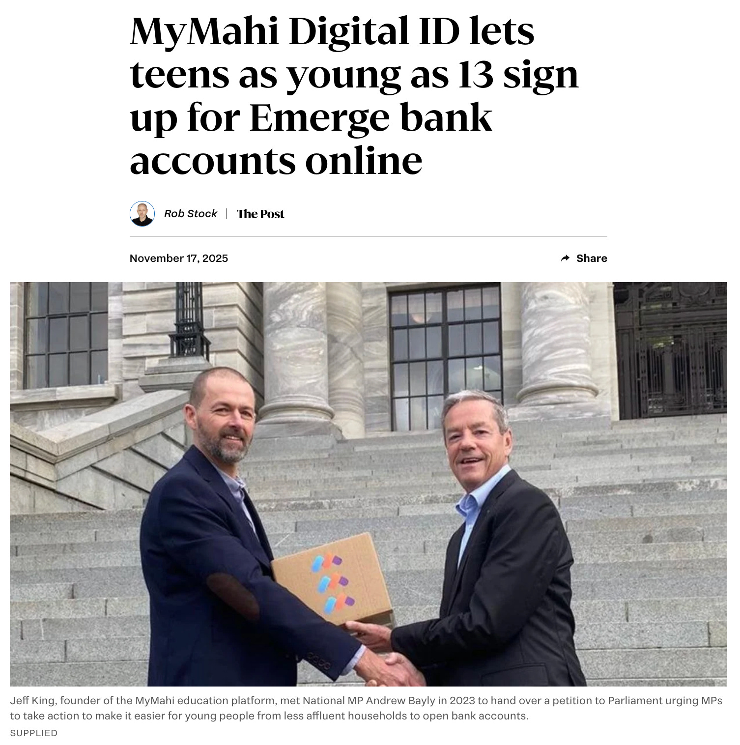 That took him into the head offices of the banks, and even to Parliament but, having drawn a blank with the big banks, he has signed up digital-only banking provider Emerge to accept the verified MyMahi Digital ID so teens can open accounts remotely.