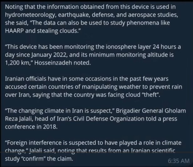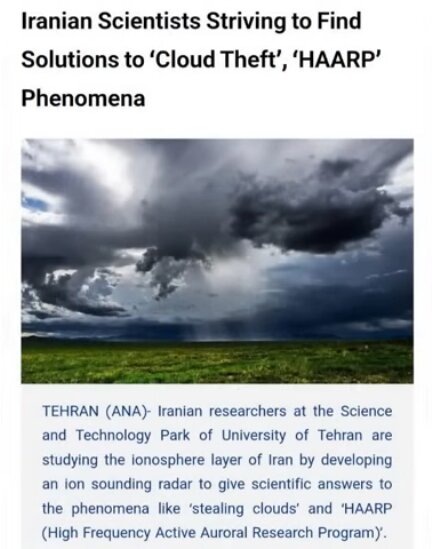 Iranian Scientists Strive to Find Solutions to “Cloud Theft” HAARP Phenomenon (2023) https://ana.ir/en/news/2091/iranian-scient…