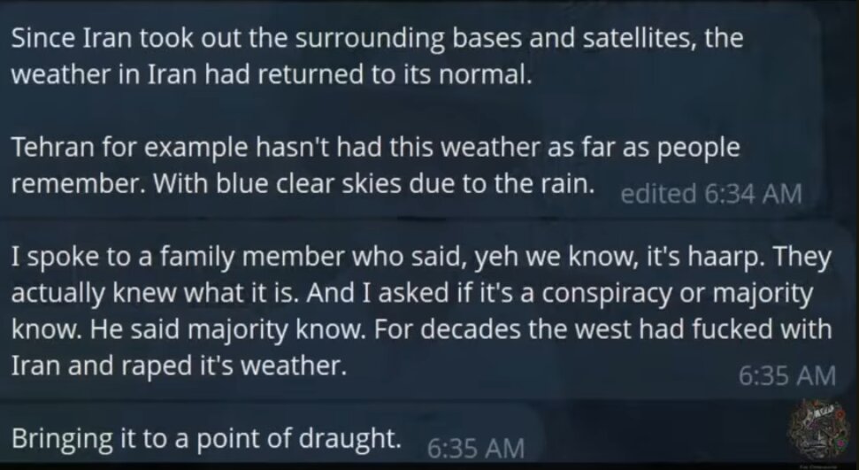 From Max Igan, at 7.48 mins in the video below, he discusses the weather in Iran and how it has returned to normal since the US bases have been taken out. Iran had done a study in 2023 to figure out the possibility of ‘cloud stealing via HAARP’.