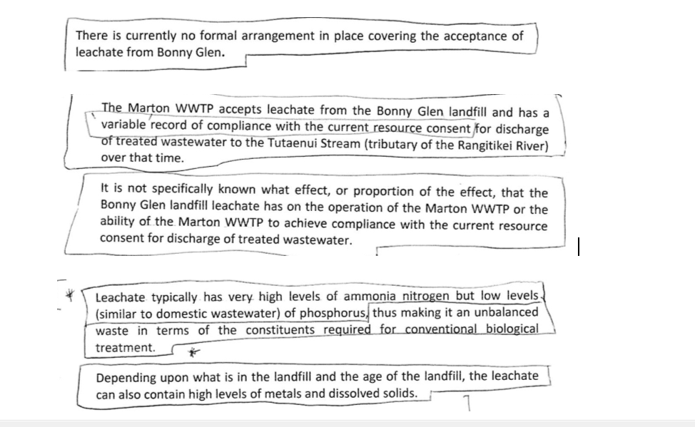 On February 24th Hamish Allan, a Marton resident, presented a submission to the panel on a topic that is not considered to be part of the hearing. Neither, as was pointed out prior to the hearings, were property values or trucks. Ironically, since these are the very concerns which automatically arise when a neighbouring landfill announces plans to quadruple in size. Nevertheless, Mr Allan’s submission concerns the leachate that is disposed of through Marton’s Waste Water Treatment Plant (WWTP) and has been for nine or so years (deemed the RDC’s concern, not Midwest Disposals’) . This has been, rather than a formal arrangement on paper … a ‘gentleman’s agreement’. The levels have been poorly reported, not tested consistently and there are many non compliances, as Mr Allan’s submission demonstrates. He has supported his submission with documented evidence. Just prior to Christmas 2014 the Wanganui Chronicle reported that the exceeded leachate levels had likely been harming the local Tutaenui Stream. There have been by all appearances, no penal consequences issued by Horizons for these failures in compliance by the RDC. Following is Mr Allan’s submission which outlines the history of how the Marton Community Committe (MCC) of which he was a member at the time, tried, albeit unsuccessfully, to address this in 2011. There needs to be accountability here … as Mr Allan points out in his submission …