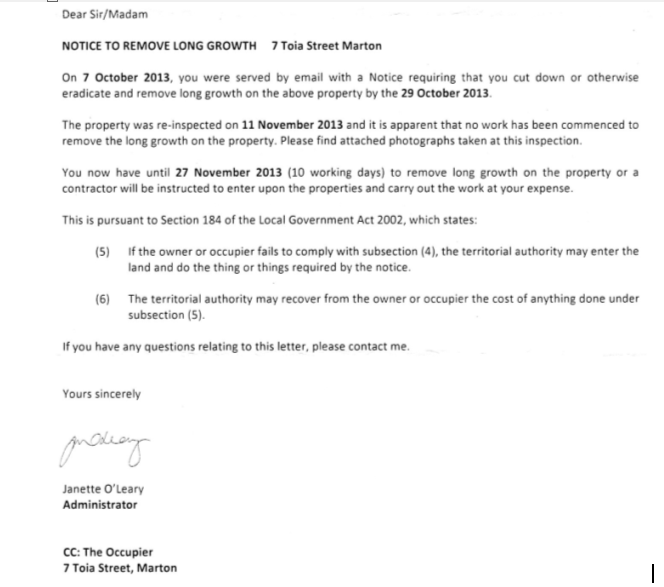 I received a number of letters last year from RDC because my lawns were overgrown & the second letter quoted a passage from the local govt. act to remind me that If I didn’t do what I was told, when I was told, they would send around a contractor and I’d have to cover the cost:
