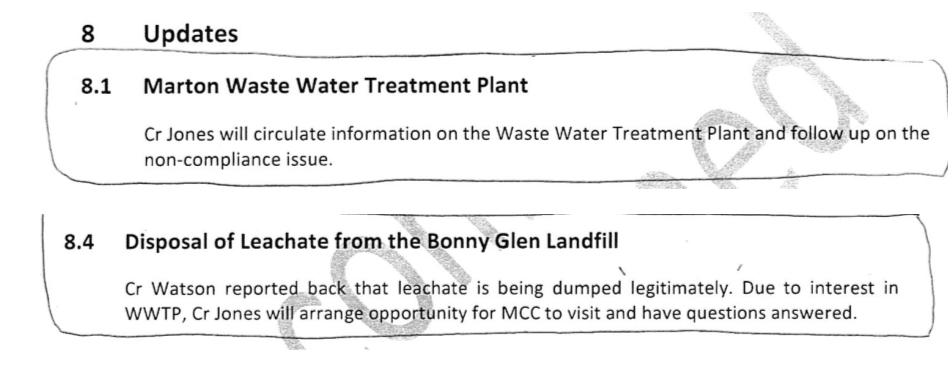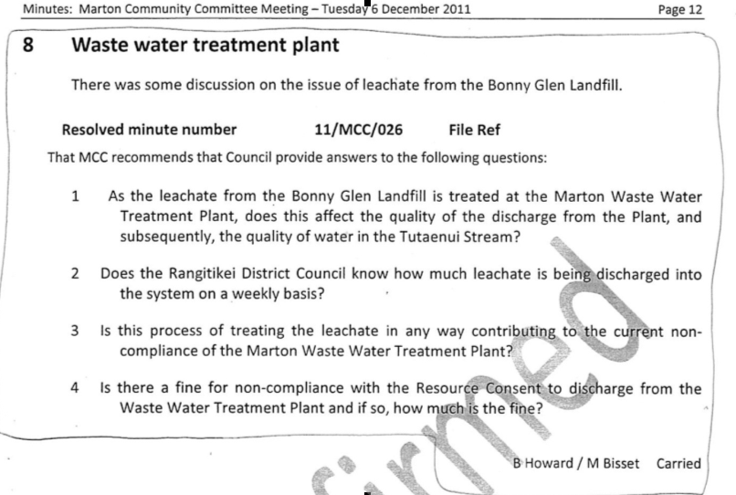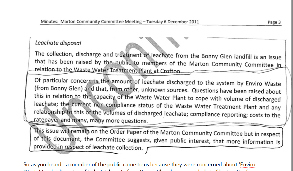 What’s more, the minutes of the Community Committee meeting in February 2012 detail Council’s deliberate attempt at avoiding any direct response to the issue of the leachate: