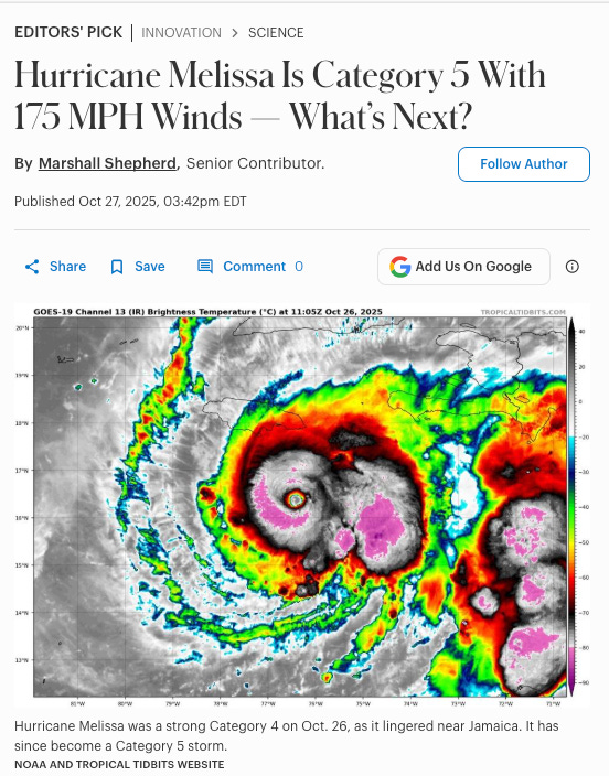 Quite predictably, NOAA has removed the entire trajectory of this transparently manufactured superstorm from the National Hurricane Center website. Because of Melissa’s absurdly manipulated path from the very start, they really had no choice as geoterrorism investigators and weather warfare researchers would have easily exposed the plot by its very odd behavior.