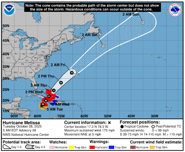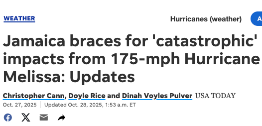 N.B. What follows are the usual MSM reports that are hyping the 175 mph winds just prior to landfall. If this wind speed is accurate, then Mega Hurricane Melissa is practically a hurricane-tornado just like weather weapon Hurricane Michael when it devastated a large swath of north Florida in October of 2018.
