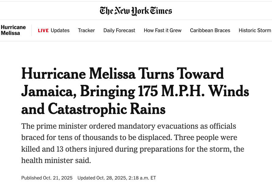 Prime Minister Andrew Holness of Jamaica issued dire safety warnings and ordered mandatory evacuations as Hurricane Melissa, a Category 5 storm channeling 175 m.p.h. winds and enough moisture to drop nearly three feet of rain, made a turn toward his country’s southern coast and its 2.8 million people on Monday.