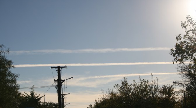 Day after day there is evidence of long trails up there which do not, as condensation trails should, rapidly disappear. Instead they linger and swell, and spread out into complete cloud cover.  They can even be seen on satellite images … world wide. Scientists, whistle blowers, politicians and ordinary people world wide, have compiled undeniable evidence that proves they are not just simple contrails or vapour trails as I recall them. They are known to contain a very long list of chemicals … our weather is being manipulated or geoengineered. This is all verified in the official documentation as well. The Space Preservation Act 2001, HR2977 (Sec 7, (2) (B) ii) for instance, refers to the trails as  ‘chemtrails’ and defines them as an ‘exotic weapons system’. (The term ‘chemtrail’ incidentally, has become almost a slang term). I personally realized something was very wrong with them three years ago and have been documenting and researching the available information ever since. I have also chatted with people in various local places who have noticed the trails and know something is amiss here. Please, as I did, read the evidence before dismissing this as conspiracy.