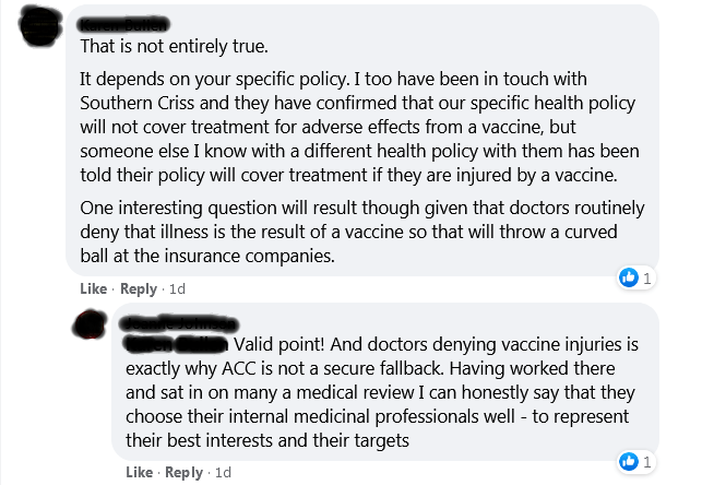 In returning to ACC’s statement that the injury must be acknowledged as clearly caused by the vaccine, you need to be taking into account with your decision to take the CV jab, the difficulty or otherwise of obtaining any confirmation of injury from the medical profession. Already a NZ woman interviewed by Peter Williams at Magic Talk Radio has described the hostility she faced from an ambulance attendant at any suggestion that her injury was caused by the covid vaccine. In addition she had to “self-report[ed] her reaction to CARM as her medical centre refused to.”