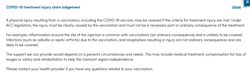 Highlighting … “A physical injury resulting from a vaccination, including the COVID-19 vaccine, may be covered if the criteria for treatment injury are met. Under ACC legislation, the injury must be clearly caused by the vaccination and must not be a necessary part or ordinary consequence of the treatment”.