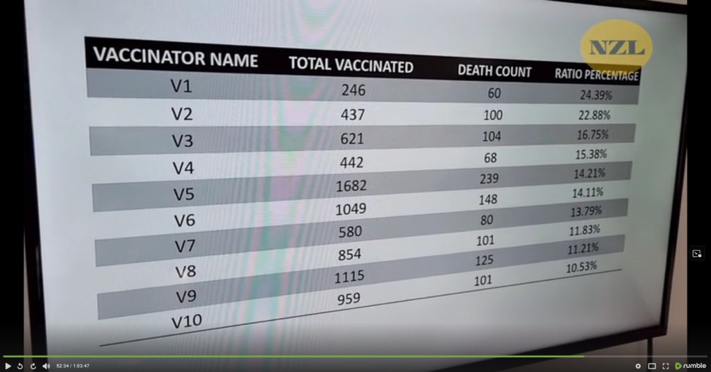 A day prior, NZ media personality and politician Liz Gunn introduced the Ministry of Health database manager to the world. He calls himself Winston Smith in a nod to the ‘hero’ of Orwell’s 1984. His data demonstrated very high mortality after injection, over 30% of recipients dead within a year of being ‘vaccinated’ by some mobile centres (presumably vaccinating into rest homes, which will have a greater annual mortality than the general population’s 0.75%).