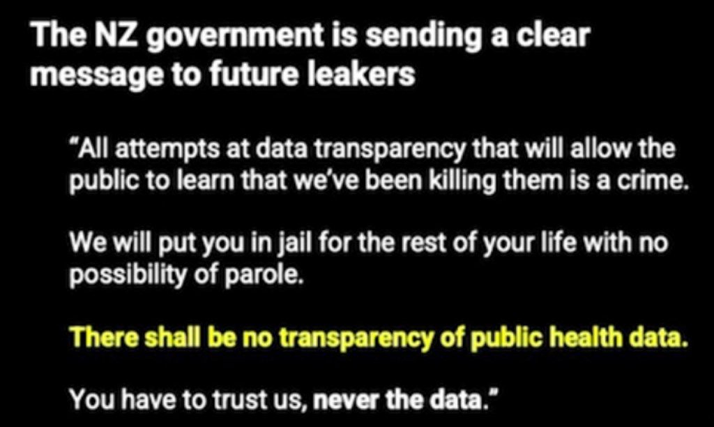 All a must hear, however included in the collection of presentations is that of Steve Kirsch, a must watch for Kiwis. He speaks to the data release aspect and NZ Govt data analyst, whistle blower Barry Young’s revelations, addressing why governments world wide refuse to release their RLD (record level data). They would be telling you that the ‘safe & effective’ is actually not. As Steve Kirsch concludes in his presentation, in light of the NZ Govt’s response to the data release (yes they STILL claim it is safe .. for a full list of links on NZ whistleblower topic go HERE) …
