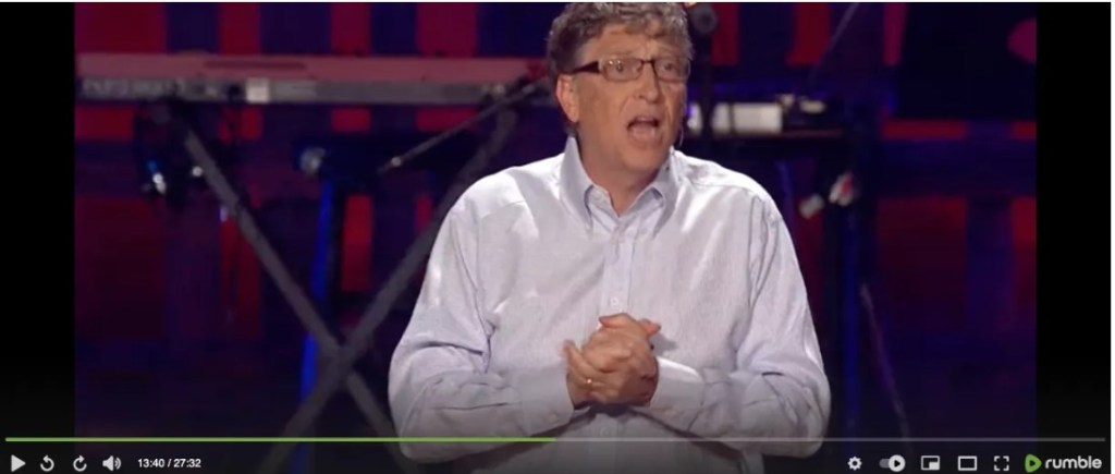 The segment with Gates making that “humanitarian” suggestion, as well as the whole talk, was on YouTube, which disappeared it early in the “COVID crisis.” So here’s Gates’ whole performance, still accessible on Rumble: (click on the vid image to watch at Rumble.com)