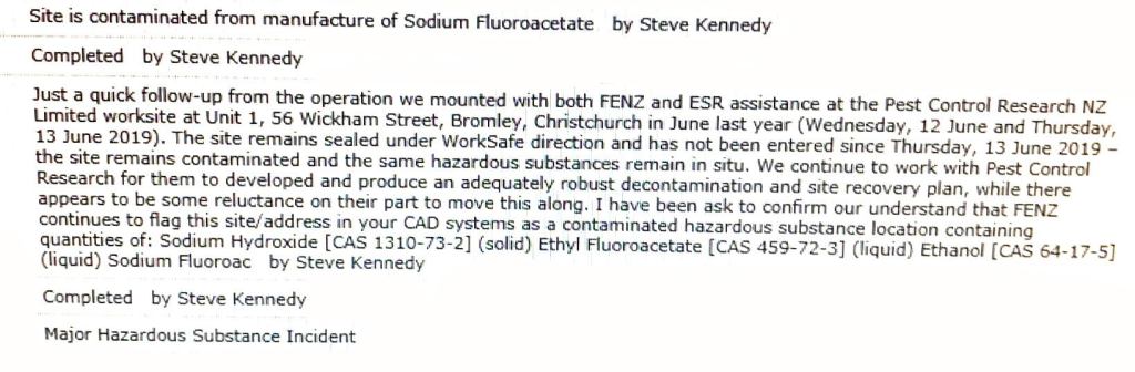 If you are not manufacturing sodium fluoroacetate, but only importing it, why do you need the chemicals used to make it?! An important question to have asked, surely? As the article points out, manufacturing sodium fluoroacetate is not permitted in NZ. This building contained ethyl fluoroacetate, sodium hydroxide, and ethanol… the products needed to MANUFACTURE pure 1080 (sodium fluoroacetate). It also contained sodium fluoroacetate.